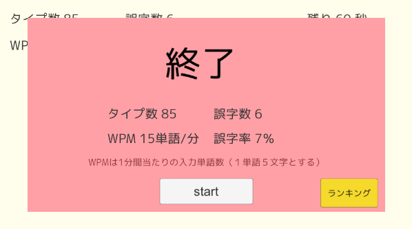 こんな感じでタイプした文字数、間違った文字数、誤字率、WPMが表示されるようにしました。