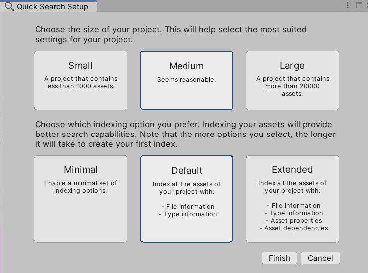 アセット、シーン上のオブジェクト、設定、メニューなど色々なものを一気に検索できる