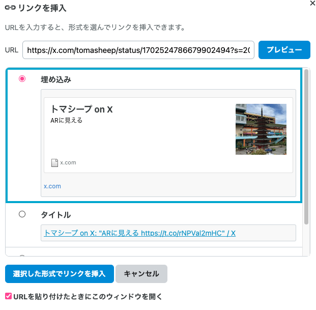 いつものようにブログにTwitterのリンクをCtrl+Shift+Vで貼り付けたら、埋め込み形式を選んでもこんな見た目になった;;
