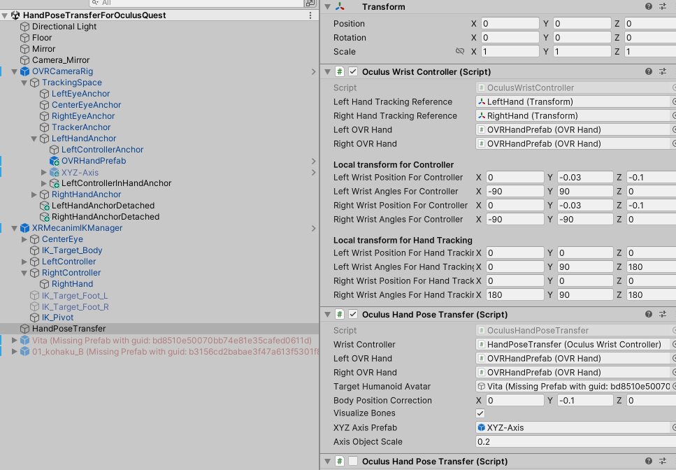 あとこのアセットを使う前から、コントローラーを置いてハンドトラッキングモードにすると手の角度が変になる。