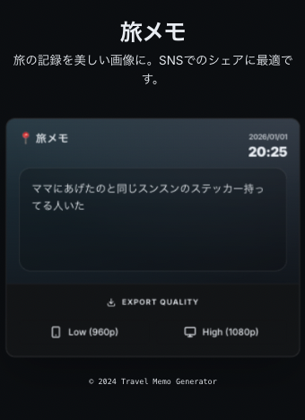 旅行ブログで、基本書きたいこと全部写真に撮って写真経由で思い出してブログ書いているんだけど、写真に撮れないことを文字でメモして低解像度で横長でスクショして保存できると便利だな〜と思って作ってみた。