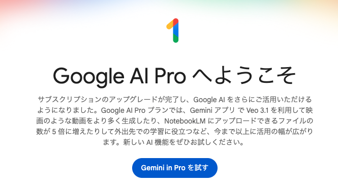 1月にチャッピーの期限を機に、Google AI Proプランにした。初めてなので2ヶ月無料。