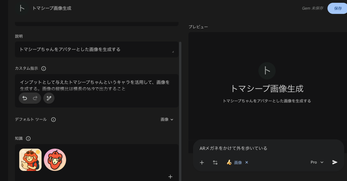 カスタム指示やモードを事前設定して呼び出せるもの。トマシープちゃん画像生成Gemを作ってみた。