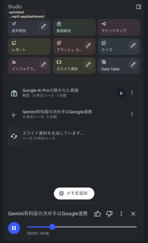 このアウトプットを普通のGeminiやリサーチツールで使えればいいのに。使えるのかな?DeepResearchはNotebookLM側でもできた。いいね